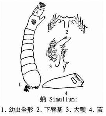 幼虫呈蛆型。后端膨大,头胸分界明显。头部有一对多毛的取食刷,前胸腹面有一突起。可借以匍匐,栖于流水中,体末端膨大,以吸盘固定在水中岩石或植物体上,随水流而斜伸。