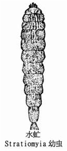 幼虫体长为10一50mm。体扁梭形,色暗,体节分明,末端有丛生环毛的呼吸管。在水草和丝状藻类堆积处较多,以藻类和腐烂的植物为食,一年一个世代,以幼虫越冬.成蛹时必须爬到陆地上来,如水虻Stratiomyia。