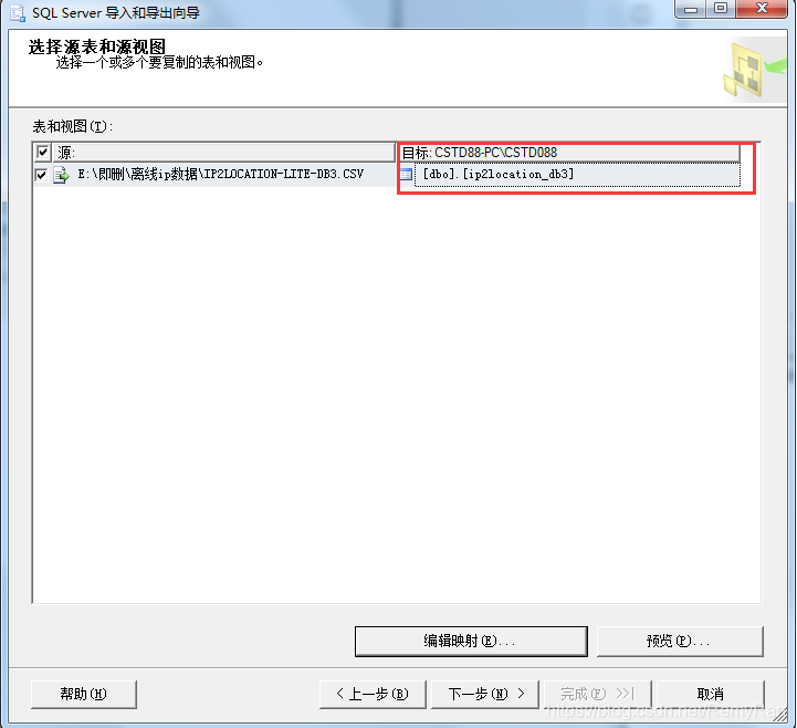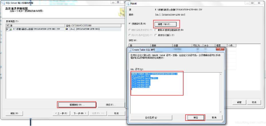 选择目标表,也可以不选择目标表,直接根据导入文件的名称创建一个新表,点击编辑映射按钮可以自行编辑创建表的SQL