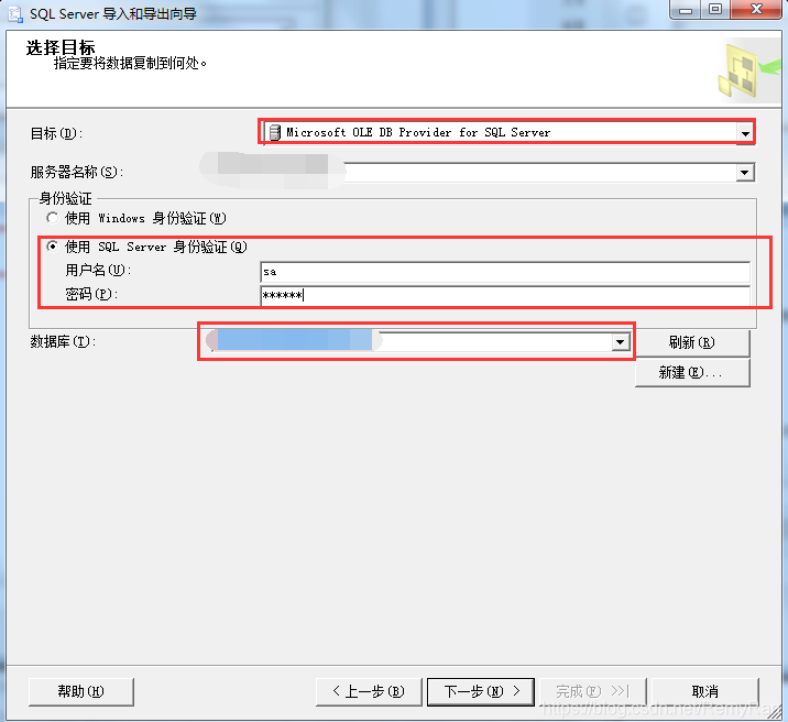目标选择Microsoft OLE DB Provider for SQL Server,服务器我这边选择自己电脑,身份验证使用SQL Sqlserver身份验证,填写正确的用户名和密码,选择要导入到的数据库,下一步;