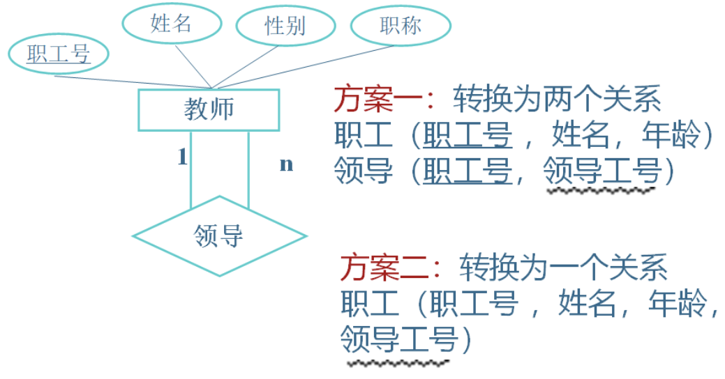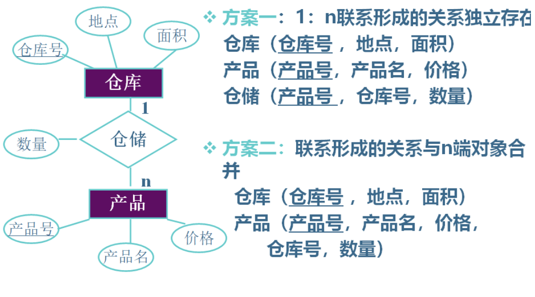 (2)一个 1:n 联系可以转换为一个独立的关系模式,也可以与 n 端对应的关系模式合并