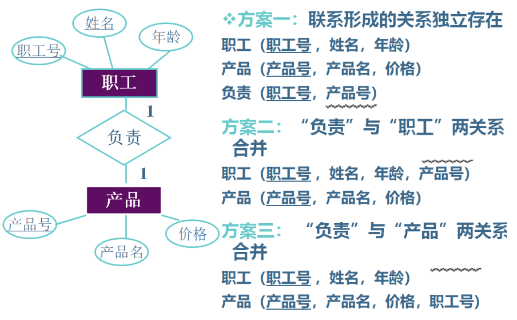 (1)一个 1:1 联系可以转换为一个独立的关系模式,也可以与任意一端对应的关系模式合并