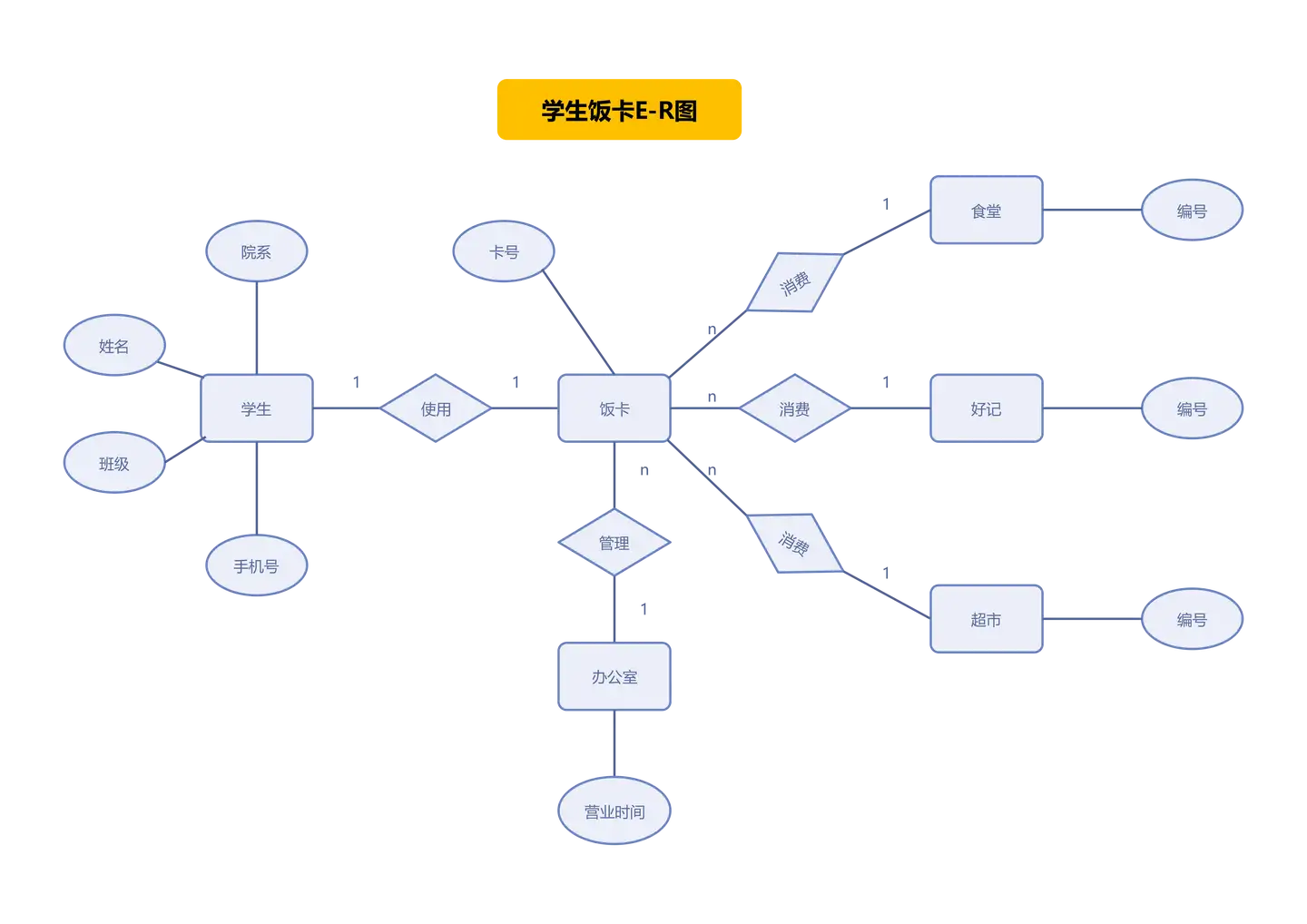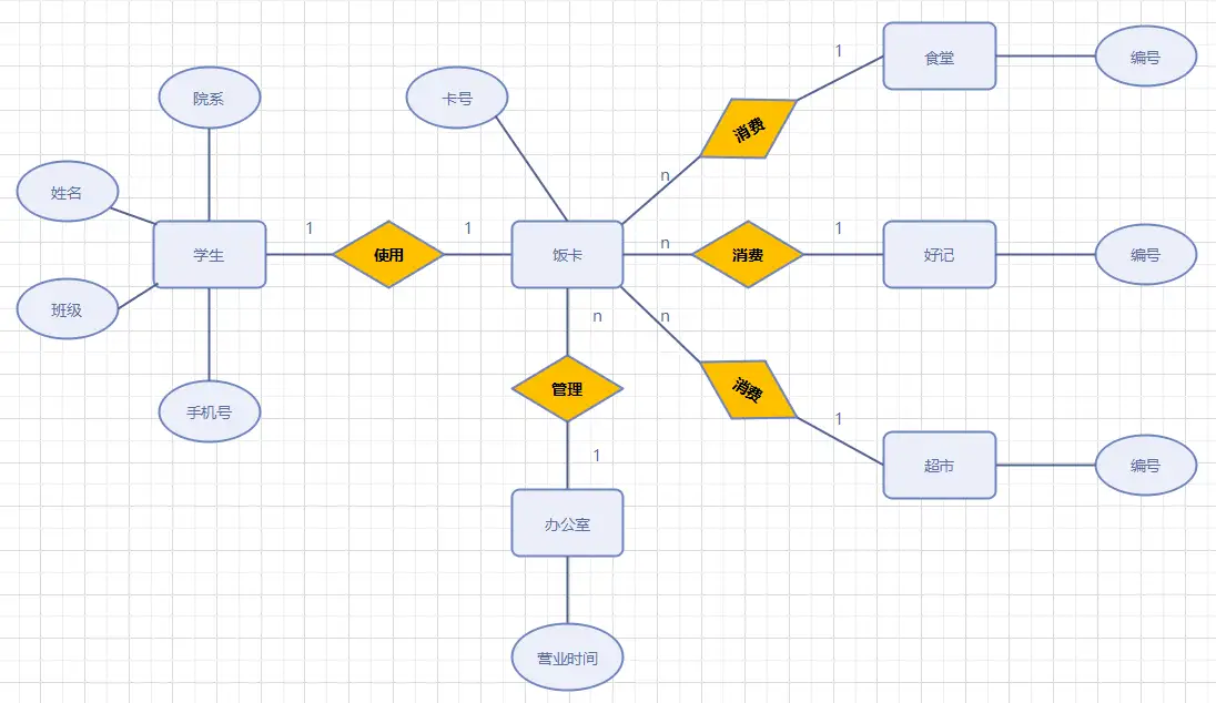 如果对于实体集 A 中的每一个实体,实体集 B 中有 n 个实体($n \ge 0$)与之联系,反之,对于实体集 B 中的每一个实体,实体集 A 中至多只有一个实体与之联系,则称实体集 A 与实体集 B 有一对多联系,记为 1:n。