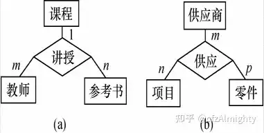 例如,对于课程、教师与参考书 3 个实体型,如果一门课程可以有若干个教师讲授,使用若干本参考书,而每一个教师只讲授一门课程,每一本参考书只供一门课程使用,则课程与教师、参考书之间的联系是一对多的,如图(a)所示。