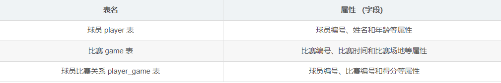 比赛表 player_game (球员编号、姓名、年龄、比赛编号、比赛时间和比赛场地等属性),这