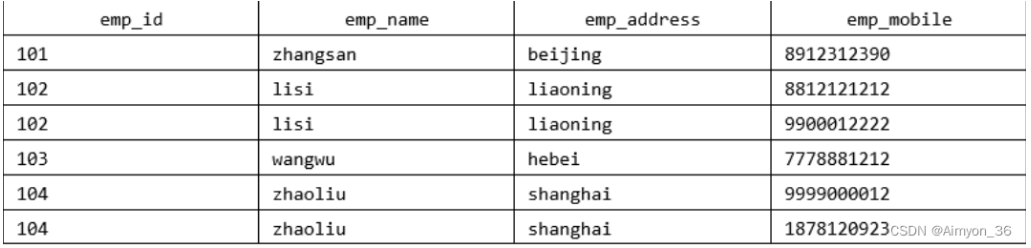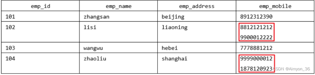 emp_mobile 值违反了该规则。为了使表符合 1NF ,我们应该有如下表数据: