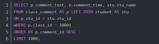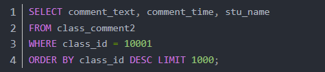 要查询某个课程的前 1000 条评论时,需要关联 class_comment 和 student这两张表来进行查询。