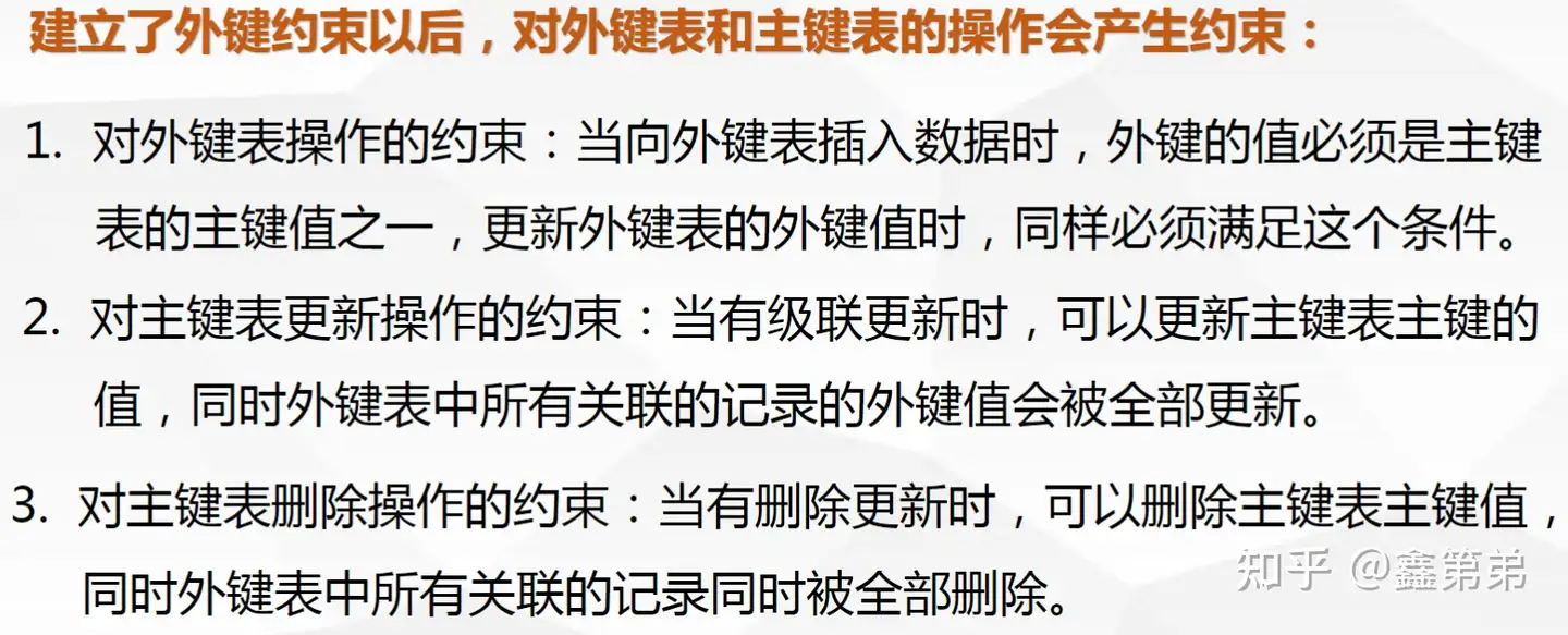 对于两个关联的表进行数据的插入和删除时,通过参照完整性保证数据的一致性。利用 FOREIGN KEY 定义表的外键,PRIMARY KEY 或 UNIQUE 约束定义主表中的主键或唯一键(不允许空),可以实现主表和从表之间的参照完整性。定义表间参照关系:先定义主表的主键或唯一键,在定义从表的外键约束。