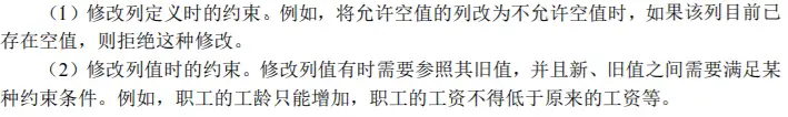 (4)动态列级约束:动态列级约束是指修改列定义或修改列值时必须满足的约束条件。