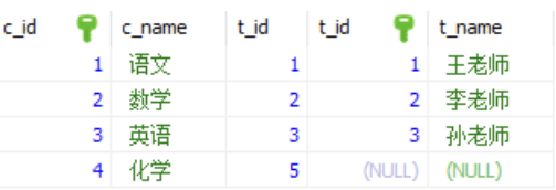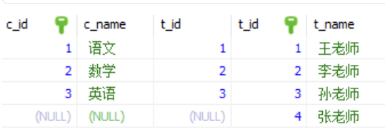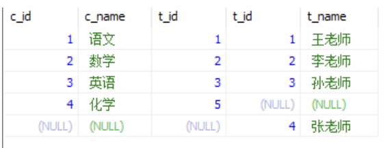 注意看,这个结果跟上面的有区别,这就是左外和上面的区别,除了查出所有符合连接的结果外,如果左表中有多余数据,会让其显示与null结合,这就是为什么叫左外的原因。