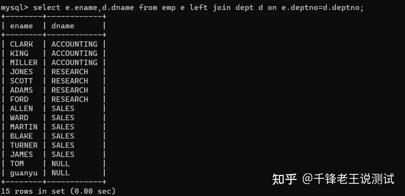 mysql> select e.ename,d.dname from emp e left join dept d on e.deptno=d.deptno;