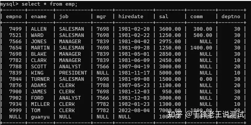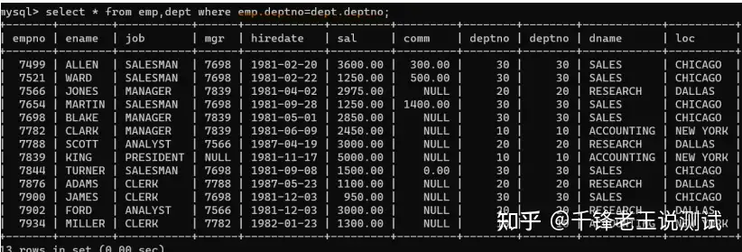 这一部分我们介绍如何使用连接查询,我们用最简单的例子来说明,比如想查出所有员工名字和他的部门名字,我们都知道员工名字在第一张emp表中,而员工的部门名字在第二张dept中,所以这个就需要连接查询。我们可以使用不同的几种方式来完成。