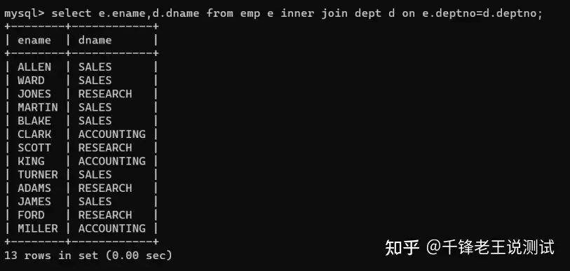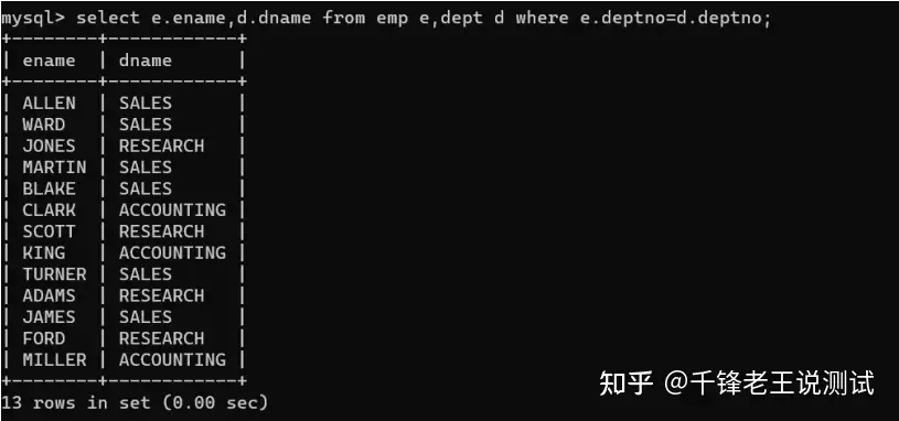mysql> select e.ename,d.dname from emp e,dept d where e.deptno=d.deptno;