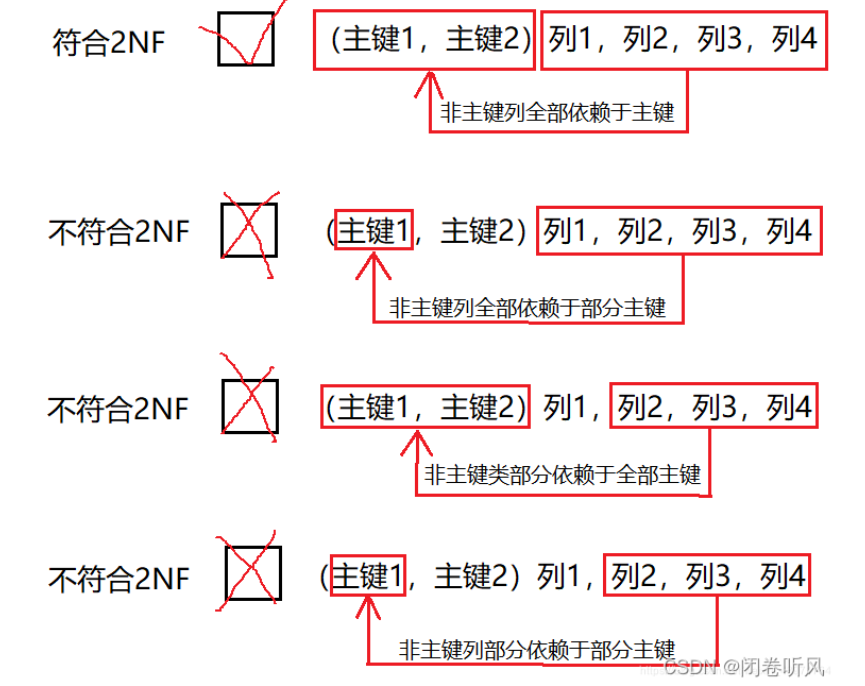 第二范式:消除部分依赖列,也就是说是否有依赖于一部分主键的列(非主键字段完全依赖主键字段)