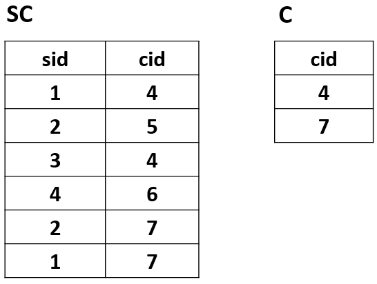 说明一下:假定SC是学生的选课信息关系,sid是学生的学号,cid是该学生所选课程的课程号。C是我们给定的一个局部的课程关系,cid是课程号。