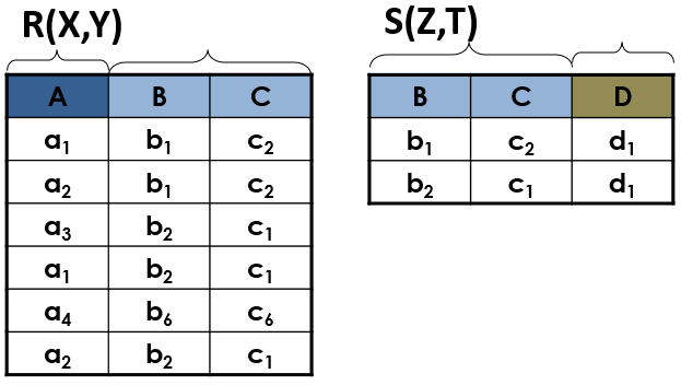 R中的Y和S中的Z具有相同的属性个数(都是2个:B、C),且出自相同域(字符串)。