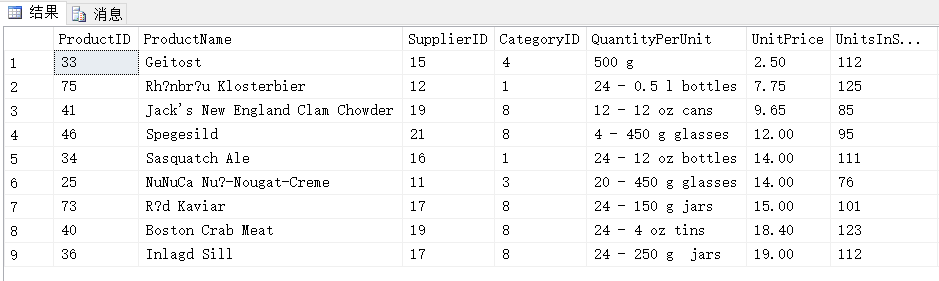 7、查询价格(UnitPrice)在20元以下,且库存(UnitsInStock)高于于70的产品信息,结果按价格升序,库存降序排列。