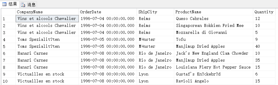 4、查询每一个订单的详细信息,要求显示客户公司(CompanyName)、下订日期(OrderDate)、送达城市(ShipCity)、所含产品名称(ProductName)和数量(Quantity)。