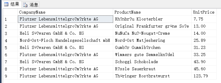 3、查询德国(germany)供应商供应的产品信息,要求显示供应商名称(CompanyName)、产品名称(ProductName)、产品价格(UnitPrice),结果按价格升序排列。