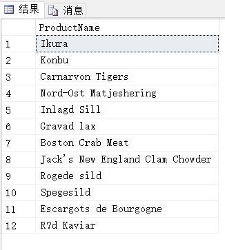 2、查询属于类型’Seafood’(CategoryName)的产品名称。