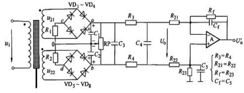 电路是以两个桥路整流后的直流电压之差作为输出的,所以称为差动整流电路。它不但可以反映位移的大小(电压的幅值),还可以反映位移的方向。