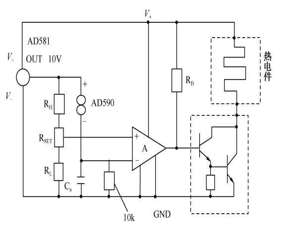 热电件产生的温度经AD590检测后产生电流控制比较器A,然后驱动复合晶体管改变电热丝电流控制温度,RH和RL为RSET设置了最高和最低的限制,控制点由RSET调节。