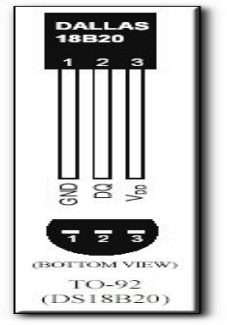 DS18B20是DALLAS半导体公司最新单线式数字温度传感器,具有测温系统简单、测温精度高、连接方便、占用口线少、系统的抗干扰能力强等优点,适合于恶劣环境的现场温度测量,如环境控制、设备或过程控制、测温类消费电子产品等。其小体积封装只有三个引脚,如图7-24所示,其中DQ为数字信号输入/输出端,GND为电源地,VDD为外接供电电源输入端(在寄生电源接线方式时接地)。