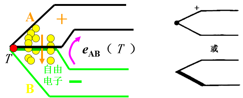 两种不同的金属互相接触时,由于不同金属内自由电子的密度不同,在两金属A和B的接触点处会发生自由电子的扩散现象。自由电子将从密度大的金属A扩散到密度小的金属B,使A失去电子带正电,B得到电子带负电,从而产生热电势。