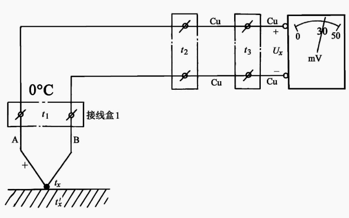 利用热电偶进行测温, 必须在回路中引入连接导线和仪表, 接入导线和仪表后会不会影响回路中的热电势呢?中间导体定律说明, 在热电偶测温回路内, 接入第三种导体, 只要其两端温度相同, 则对回路的总热电势没有影响。