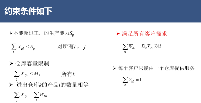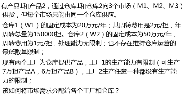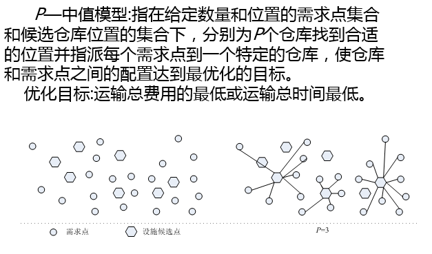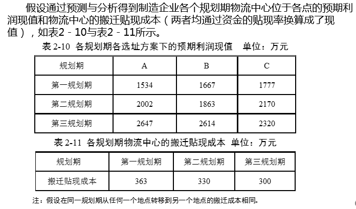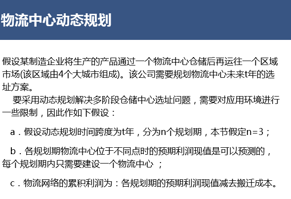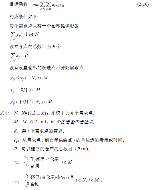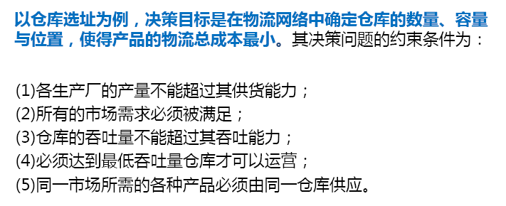 单设施选址指为单个物流设施选址,最常用的是重心法。它将运输成本作为唯一的选址决策因素,是一种静态的选址方法。该方法的目标是找出重心的位置,使得总运输成本最小。即