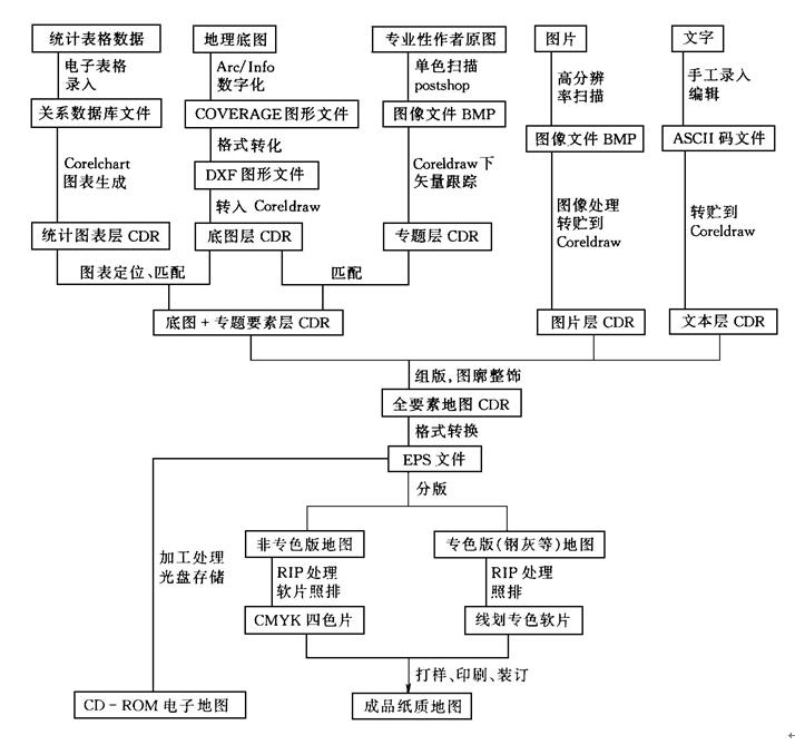 在GIS全数字化技术体系下,地图生产从资料处理、内容设计、符号设计、地图整饰,到出版准备、软片制作都能基于电子技术实现, 在这一流程中, 地图不再以纸质图形和玻璃、软片基面的形式在地图设计室、编稿室、制版印刷车间传输,取而代之的是在计算机前将地图以数字形式一次性集成处理完成,这就是现代数字技术条件下的桌面出版(Desktop Publishing,简称DTP)系统。