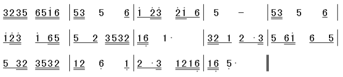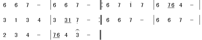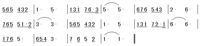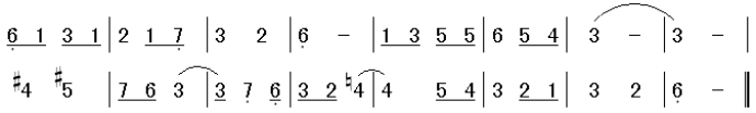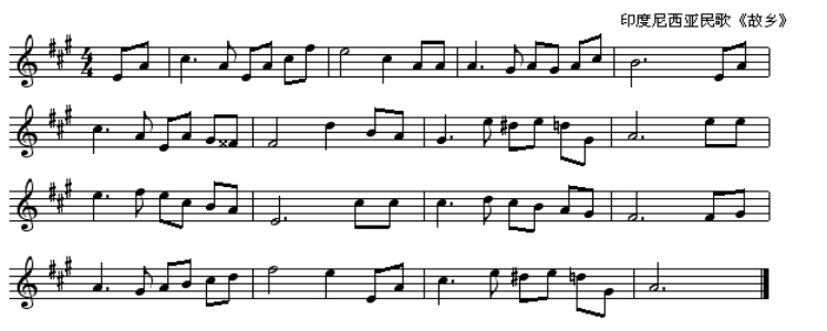 ⑹谱例45,提示:1=A,4/4拍子,A大调式。这首著名的印尼民歌悠扬而深情,但其中的难点颇多:这是一首弱起音乐,音乐的每一句都是弱起的;旋律中运用了较多的四、五、六度的跳进;第二行第1、2小节间经过式的变化音--×F音(首调唱名为mi、do、sol、do、si、升la、la );第二、四行第3小节的辅助式变化音--#D音;还应该注意的是×F音、#D音出现后紧接着就还原到了调式的自然音级音。