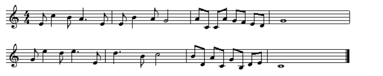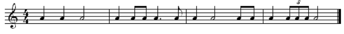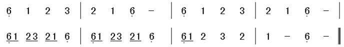 ⑴谱例22,提示:本曲为内蒙古民歌《小夜曲》,1=A,4/4拍子。音乐旋律只有la、dol、re、mi四个音级的上下行音型的五次重复,节奏也平稳简单,易于掌握。