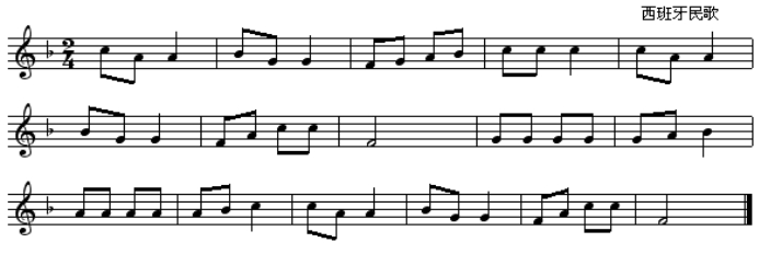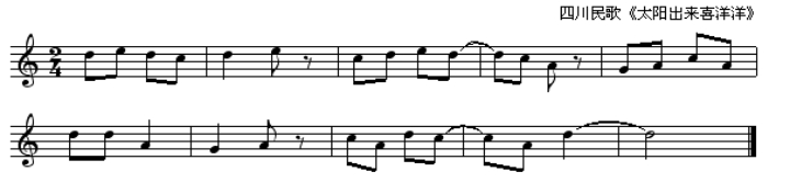⑵谱例23,提示:本曲为日本民歌《樱花》,1=D,4/4拍子。这是日本的五声音阶调式的旋律,fa、si两个我国不常用的偏音在这种调式中是骨干音级,要注意把握并仔细体会好其音准的感觉。