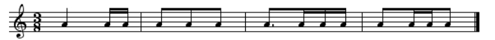 ⑵、附点音符的时长是在该单纯音符的基础上增加一半。它不是一种单列的音符时值划分类型,它是在二分性单纯音符的基础上的一种时值的补充节奏型。其时长规律为: