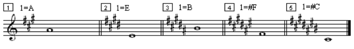 谱例19,简谱音高(1=C):2#12,3#23,5#45,……