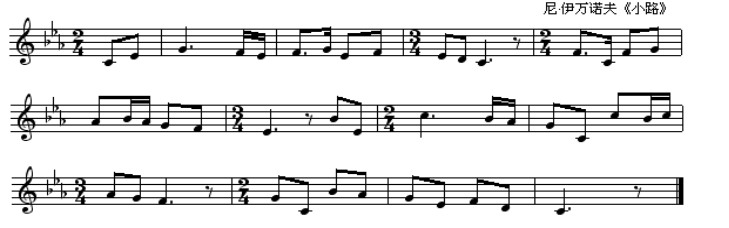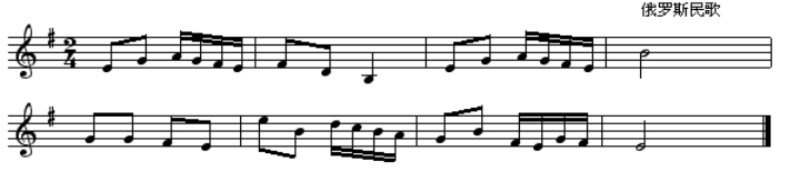 ⑷谱例43,提示:1=G,2/4拍子,e小调式。平缓的旋律、简洁的节奏体现了朴素的俄罗斯民歌风格,需要注意的是第5、6小节间的八度大跳的音高表现要准确。