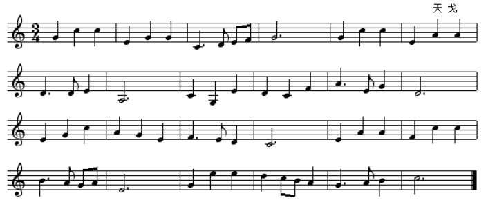 谱例2,歌曲《雪绒花》开头句,1=C,3/4,简谱唱音:3–5 2 - -……