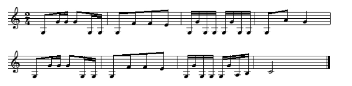 ⑴、2/4拍子的节奏型组合练习(谱例7):