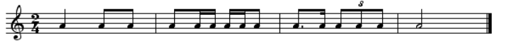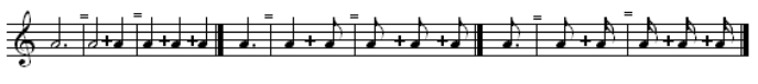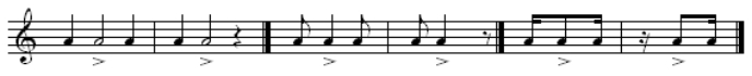 ⑶、切分不代表一种单列的音符时值划分类型,它是二分性单纯音符在强弱规律上非常规化的特殊节奏型,将强拍或强点后移至了该节奏型的中间较长时值的音符。
