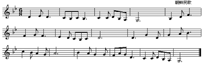 ⑵谱例41,提示:1= bB,6/8拍子,g小调式。六拍子“强弱弱”的节拍感,4小节为一句的舒缓流动的音乐旋律,是本曲的基本风格。