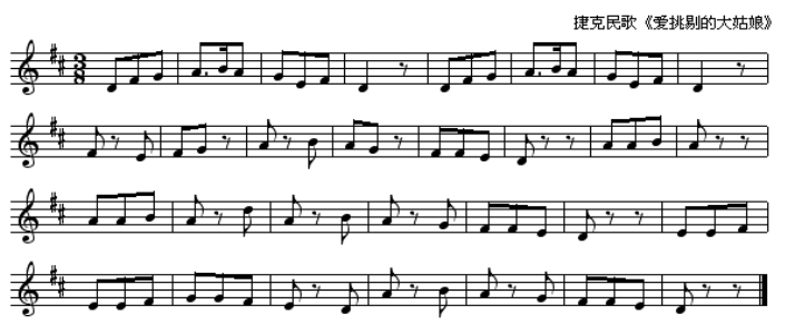 ⑸谱例44,提示:1=D,3/8拍子,D大调式。这首幽默、风趣的捷克民歌在旋律上没有太多难点,但小附点节奏、特别是从第二行起不断出现的一拍的休止,必须要先用慢速反复练习,直到心中有十足的把握,才能用原曲偏快的速度来表现出该曲的风格。