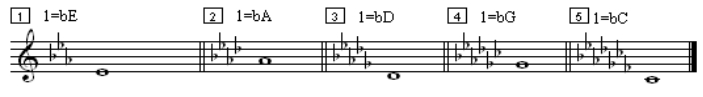 ⑹谱例33,三—七个降号的调,1=A(E、B、#F、#C),调高位置do音依次在第二间第一线、第三线、第一间、下加一线上。