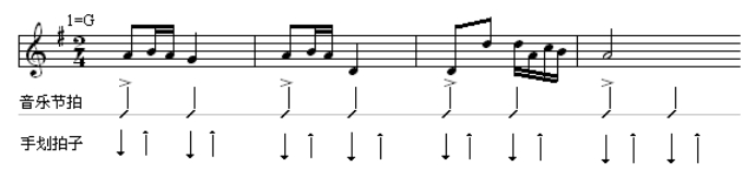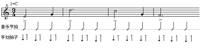 ⑶、心中默唱上述音乐,由跟随击掌改为单手上下划拍子。