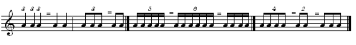 它也可以改变了符点音符的时长,使之变为二分、四分等其它的均分化时值。如,二、四连音的时长规律为2(或4)个音均分3个相同单纯音符的时长。