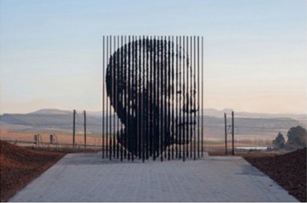 这尊像使用50根10米长的钢柱为媒材,钢柱的体面变化形成曼德拉头像,同时又指代监狱铁窗——描述如此简单是因为它一目了然。之前,当“政治人物雕像”几个字在你眼前出现时,你大脑里升腾的一定是一尊白色石膏像,不管是站立的招手式,还是庄重的胸像,他们一定体量巨大,严肃地矗立在城市的环岛中心、大学校园或者大广场之上。当白色石膏像、青铜等身像成为伟人、名人雕像的代名词时,我们很难奢望出现充满趣味性、现代性与艺术性的人物雕像。这一雕像的意义正在于它打破了这一传统惯例,给我们带来了新的艺术趣味。