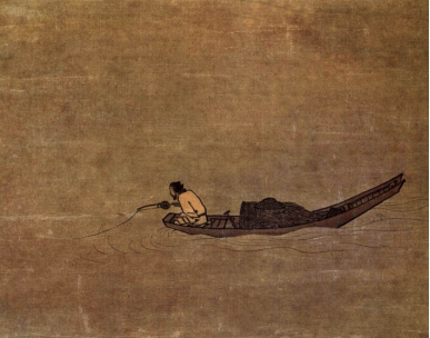 南宋著名山水画家马远的名作《寒江独钓图》(图5-26),只画了漂浮于水面的一叶扁舟和一个在船只上独坐垂钓的渔翁,四周除了寥寥几笔的微波之外,几乎全为空白。然而,就是这片空白表现出了烟波浩渺的江水和极强的空间感,衬托了江上寒意萧瑟的气氛,从而更加集中地刻画了渔翁专心于垂钓的神气,也给欣赏者提供了一种渺远的意境和广阔的想象余地。