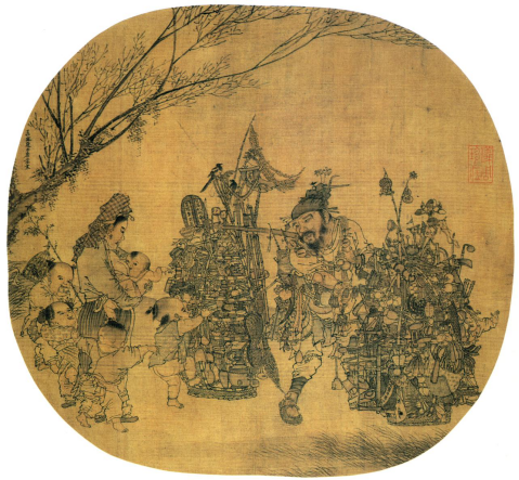 如果想进一步了解农村生活,可以看一看李嵩的《货郎图》(5-32)。这幅作于1210年的扇面册页,很好地反映出担着小百货的货郎到农村去售卖,乡村妇女和孩子出来围观、购物的场景,这小小的一幅画对当时宋代普通人生活情景的展示胜过千言万语。