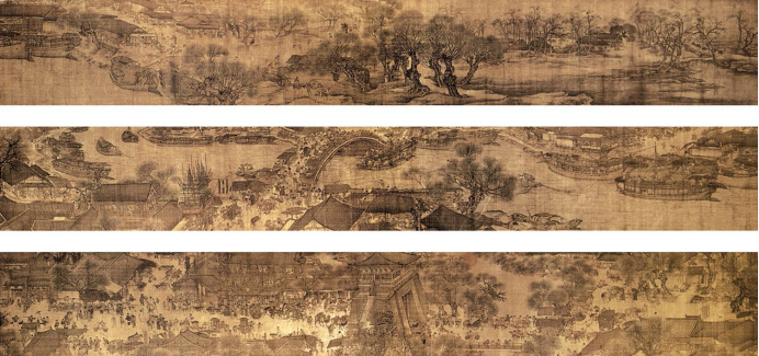 《清明上河图》(图5-31)中国北宋风俗画作品,长卷,绢本,淡设色,宽24.8厘米,长528厘米,作者张择端。现藏于北京故宫博物院。这幅长卷分为 “城郊风光”、“汴河虹桥”、“市区街道”三部分。采用了传统的手卷形式,以不断挪动视点的方法来摄取所需景象。大到广阔原野、浩瀚河流、高耸的城楼,细到舟车上的钉子、摊贩上的小商品、市招上的文字都和谐地组织成统一整体,繁而不乱,段落分明,结构严谨。画中景物,都具有典型代表性,时代气息浓郁。该画作细节刻画十分真实,在反映社会生活与物质文明的广阔性与多样性方面有着文字不可能代替的文献史料价值,是了解12世纪中国城市生活极其重要的形象资料。