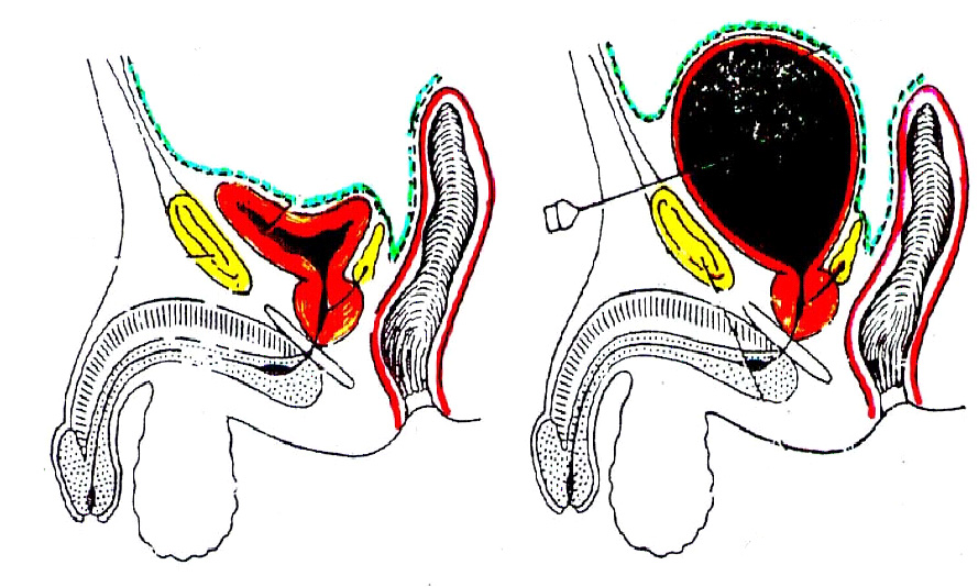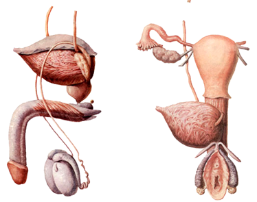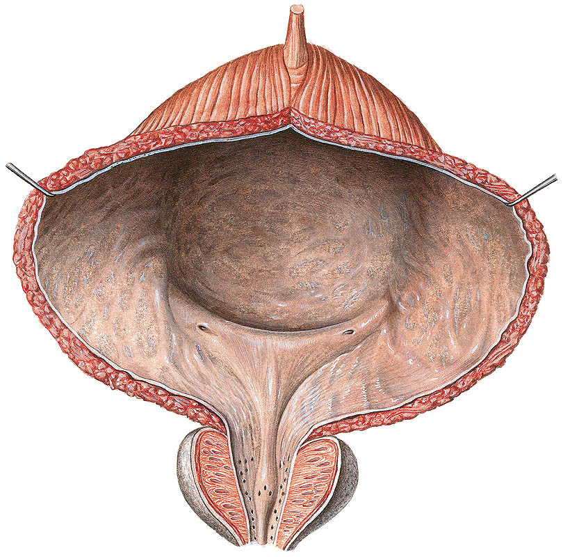 膀胱颈 neck of bladder:在膀胱下部,男性与前列腺接触,女性与尿生殖膈毗邻内口。